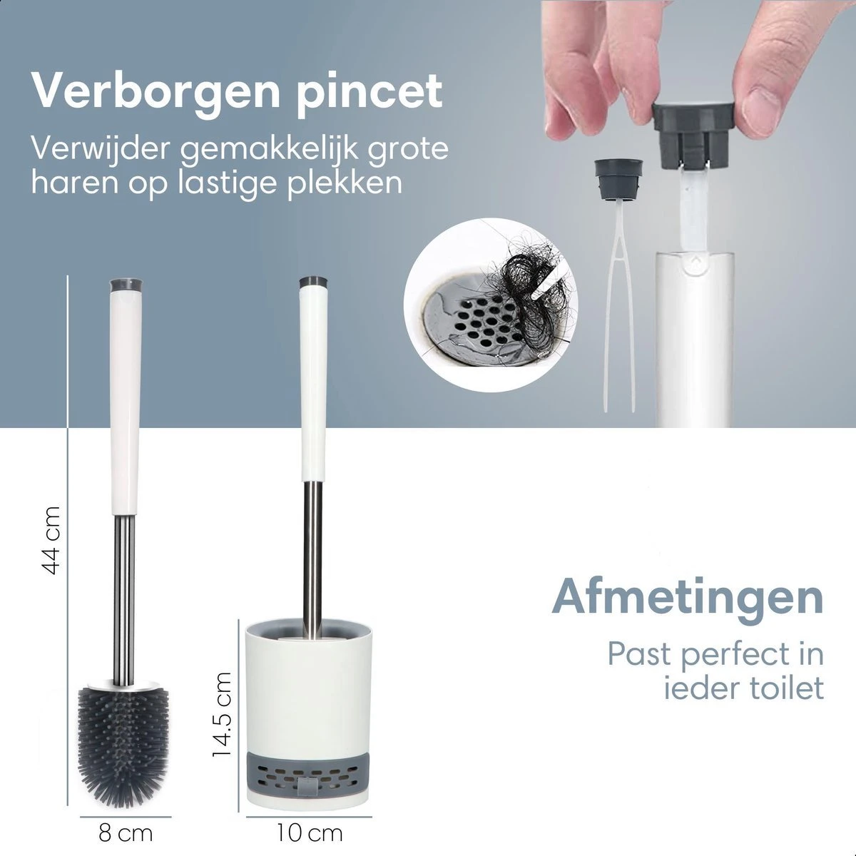 Een leuk extraatje is een verborgen pincet, hiermee kunnen grote haren eenvoudig worden verwijderd. Het pincet kan je tevens gebruiken om de vochtabsorberende pad te pakken en te reinigen met een doekje. Zo haal jij een zeer praktische en gebruiksvriendelijke toiletborstel in huis!