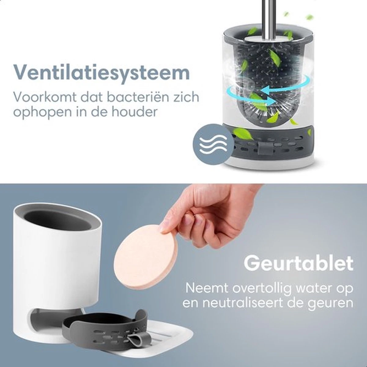 De luxe toiletborstel met houder is voorzien van een water-absorberend opvangsysteem, hierdoor heb je nooit meer last van vieze waterspetters op de vloer en muur. Het overtollige water wordt opgevangen in een bakje welke is voorzien van een geurtablet welke het water meteen opzuigt zodat de houder droog blijft en de geuren neutraliseert. Bovendien is de houder zeer hygiënisch dankzij het ingebouwde ventilatiesysteem, dat voorkomt dat bacteriën zich kunnen ophopen in de houder. De houder kan op de grond geplaatst worden of eenvoudig aan de muur worden opgehangen zonder boren, dankzij de bijgeleverde plakstrip.