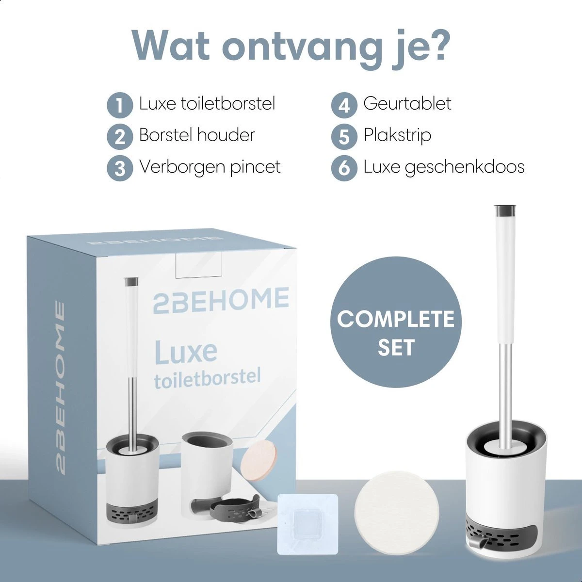 • Inhoudverpakking: 1x toiletborstel, 1x houder, 1x vochtabsorberende pad, 1x plakstrip en 1x Pincet