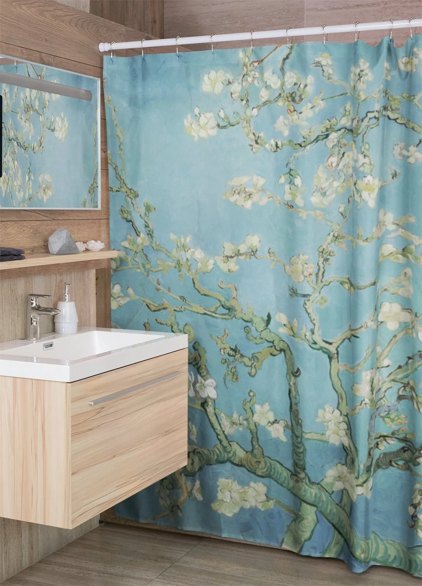 Dit Douchegordijn heeft een mooi Design van Amandebloesem, een wereldberoemd schilderij van Vincent van Gogh. Het frisse design tovert je badkamer om in een moderne en aantrekkelijke badkamer. Het douchegordijn heeft een afmeting van 180 cm breedte x 200 centimeter hoogte. Het douchegordijn wordt geleverd met witte ringen en heeft een leuk en licht design. Het lichte design oogt ruimtelijk en sfeervol. Je kan dit douchegordijn eenvoudig aan een stang bevestigen door de meegeleverde ringen. Doordat het douchegordijn gemaakt is uit polyester droogt het snel en gaat het schimmelvorming tegen. Toch een keer opfrissen? Het douchegordijn kan in de wasmachine op 30 graden worden schoongemaakt.