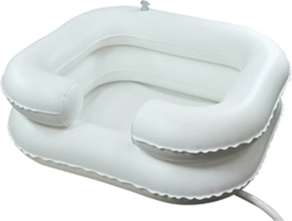 Deze opblaasbare wasbak is ideaal voor het wassen van haar voor iemand die niet gemakkelijk uit bed kan komen. De wasbak zorgt ervoor dat het hoofd en de schouders goed gepositioneerd zijn en niet nat worden. De wasbak heeft een dubbele rand die het water tegenhoudt en voorkomt tegelijkertijd ook het opspatten van water. De wasbak kan 4 liter water vasthouden en heeft een handige afvoerslang om het water af te kunnen voeren.