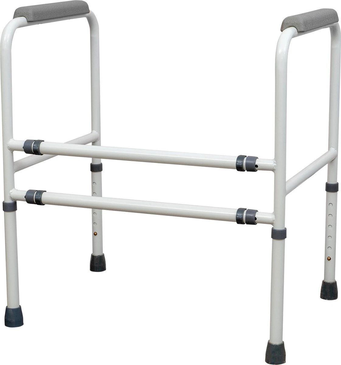 In hoogte verstelbaar toiletframe. Wit met grijze details. De breedte is geschikt voor vrijwel alle toiletten. Het frame is verpakt in een platte doos. Zeer gemakkelijk in elkaar te zetten.