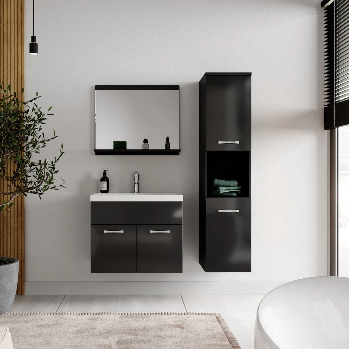 Vanwege zijn strakke afwerking is het meubel gemakkelijk schoon te maken. De set is volledig uitgevoerd in zwart met hoogglans frontjes en is gemakkelijk te monteren.