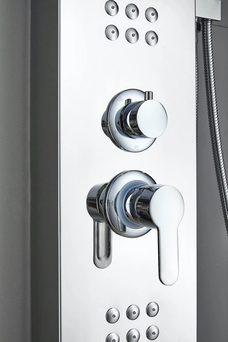 Douchepaneel Toulon is een douchepaneel gemaakt van roestvrij staal met een spiegelende afwerking. Het douchepaneel heeft twee massage units, een hoofddouche met watervalfunctie en een handdouche. Verder heeft het douchepaneel één draaiknop waarmee de vier douchestanden worden geregeld. Dit betekent dat maximaal twee verschillende standen tegelijk gebruikt kunnen worden. De andere draaiknop op het douchepaneel wordt gebruikt voor het regelen van de temperatuur door middel van een mengkraan.