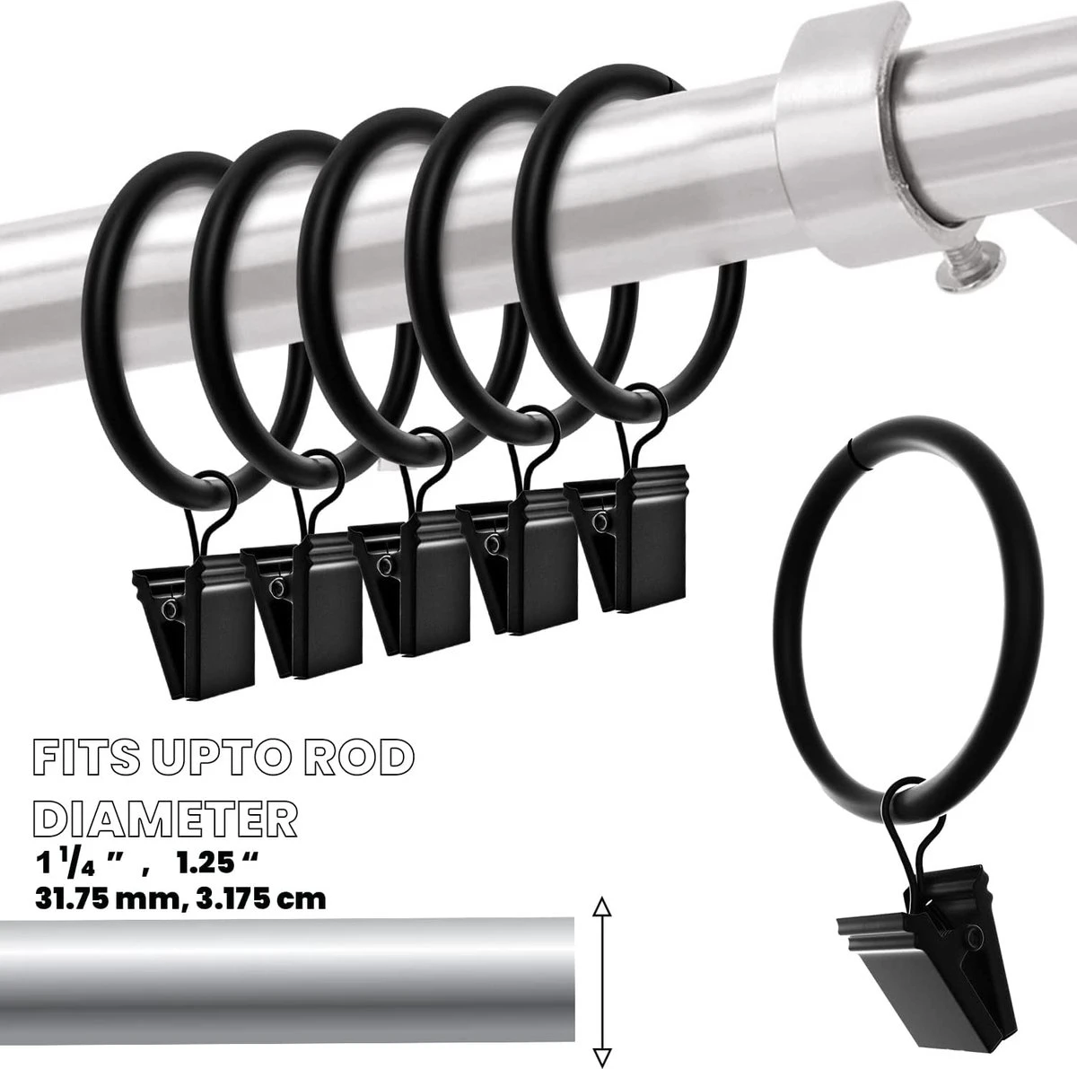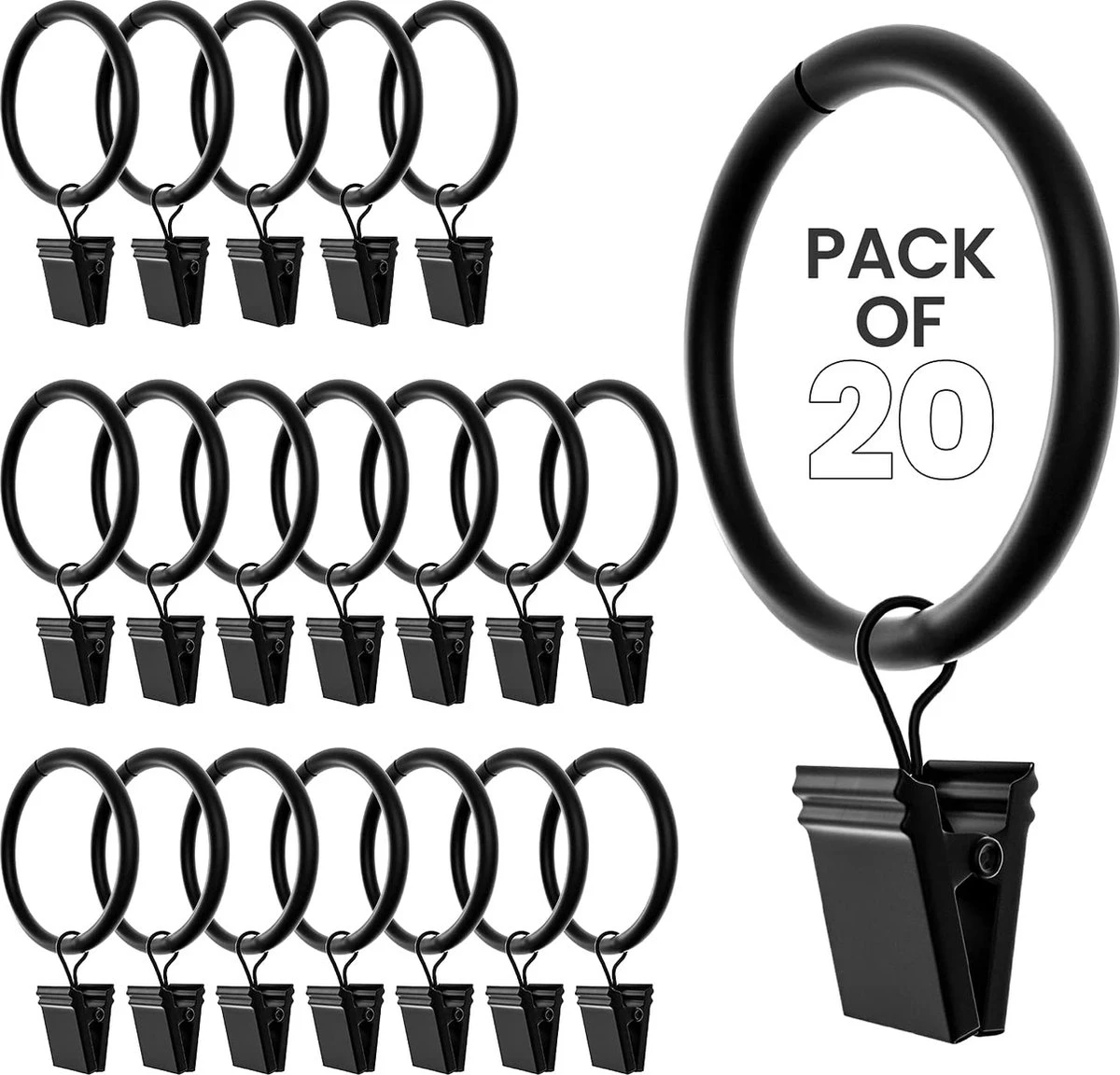 BOTC – Gordijnringen met clips – 1,5 inch set van 20 zware gordijnhaken – voor gordijnen, kappen, afbeeldingen – roestvrije en decoratieve zwarte gordijnringen voor badkamer, woonkamer en kamer.