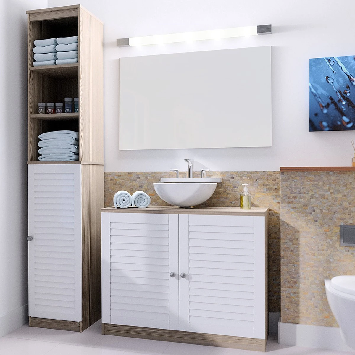 - 1 x hoge badkamerkast en 1 x wastafelonderkast