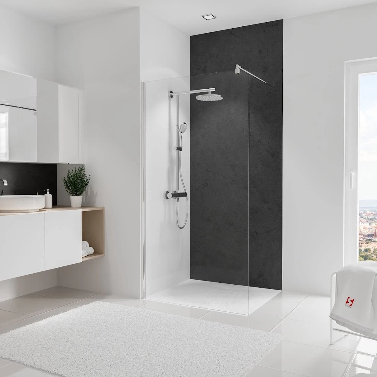 Speciaal voor gebruik in de badkamer en de douche, een waterdichte achterwand zonder voegen. Deze aluminium platen met een kunststof kern zijn slechts 3 mm van dikte waardoor er geen ruimte verlies optreed. Eenvoudig verlijmen over de bestaande wandtegel of een willekeurige ander vlak oppervlak. Voorbehandeling van de ondergrond, ontvetten en eventueel kimbanden aanbrengen. Montage is zeer eenvoudig, panelen op maat zagen met een decoupeerzaag of cirkelzaag, beschermfolie verwijderen en plaatselijk de meegeleverde dubbelzijdige aanbrengen, verlijmen met siliconelijm of middels volverlijming. De platen positioneren en goed aandrukken zodat de tape zich hecht aan de ondergrond. Randen afdichten met silicone en de volgende dag al in gebruik nemen of afmonteren van de douchecabine en andere sanitaire artikelen.
