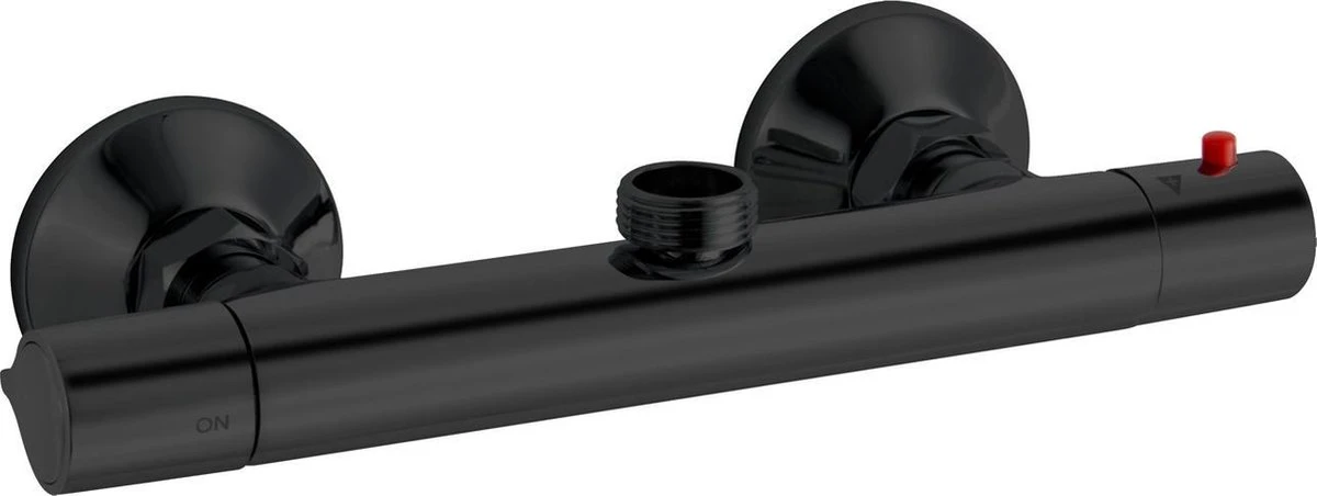 Tthermostatische douchekraan gemaakt van messing, zwart uitgevoerd. Met aansluiting voor de doucheslang aan de bovenzijde van de kraan, bediening voor de watertoevoer aan de linkerzijde en temperatuur aan de rechterzijde.