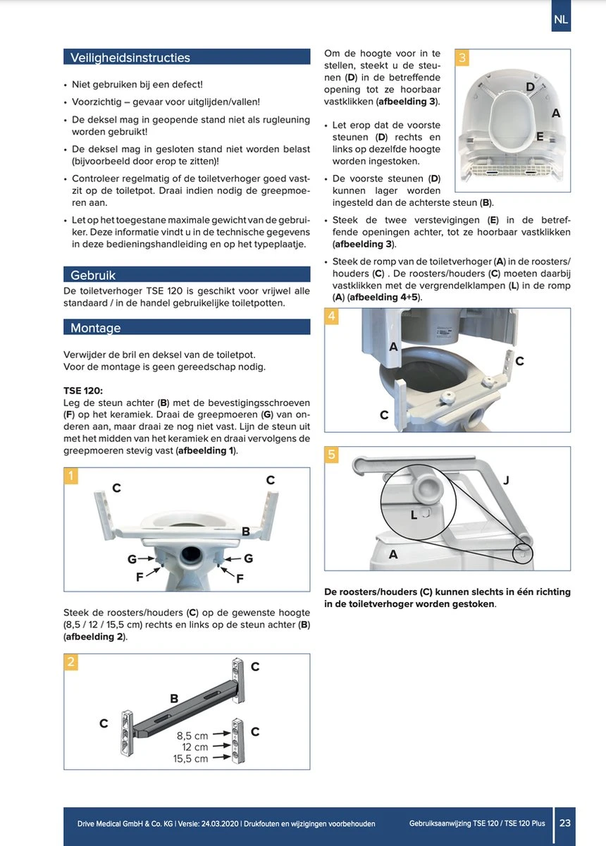 De meeste toiletten hebben een vergelijkbare maat. Hierdoor is de Brit met de speciale montagematerialen op bijna elk standaard toilet veilig te monteren/fixeren. De verhoger wordt geleverd met speciale montagematerialen geleverd, waarmee u hem zonder gereedschap kunt monteren en stevig vast kunt zetten. Toiletverhoger kan zo tot wel 120 kilo belast worden.