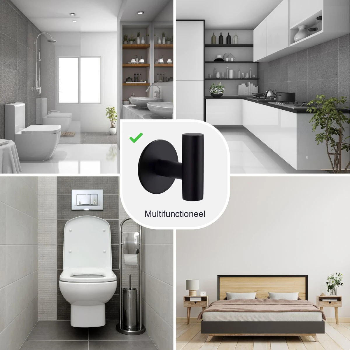 Handdoeken, theedoeken, vaatdoeken, als je ze gebruikt moeten ze droog en schoon zijn. Met deze handige ophanghaken, die je dankzij de sterke plakstrip makkelijk op een muur of kastje kunt plakken, heb je altijd een plekje om je doeken op te hangen. De zelfklevende haakjes zijn gemaakt van RVS, zwart van kleur en eenvoudig te monteren. Je hoeft er namelijk niet voor te boren. Een must have voor je badkamer of keuken.