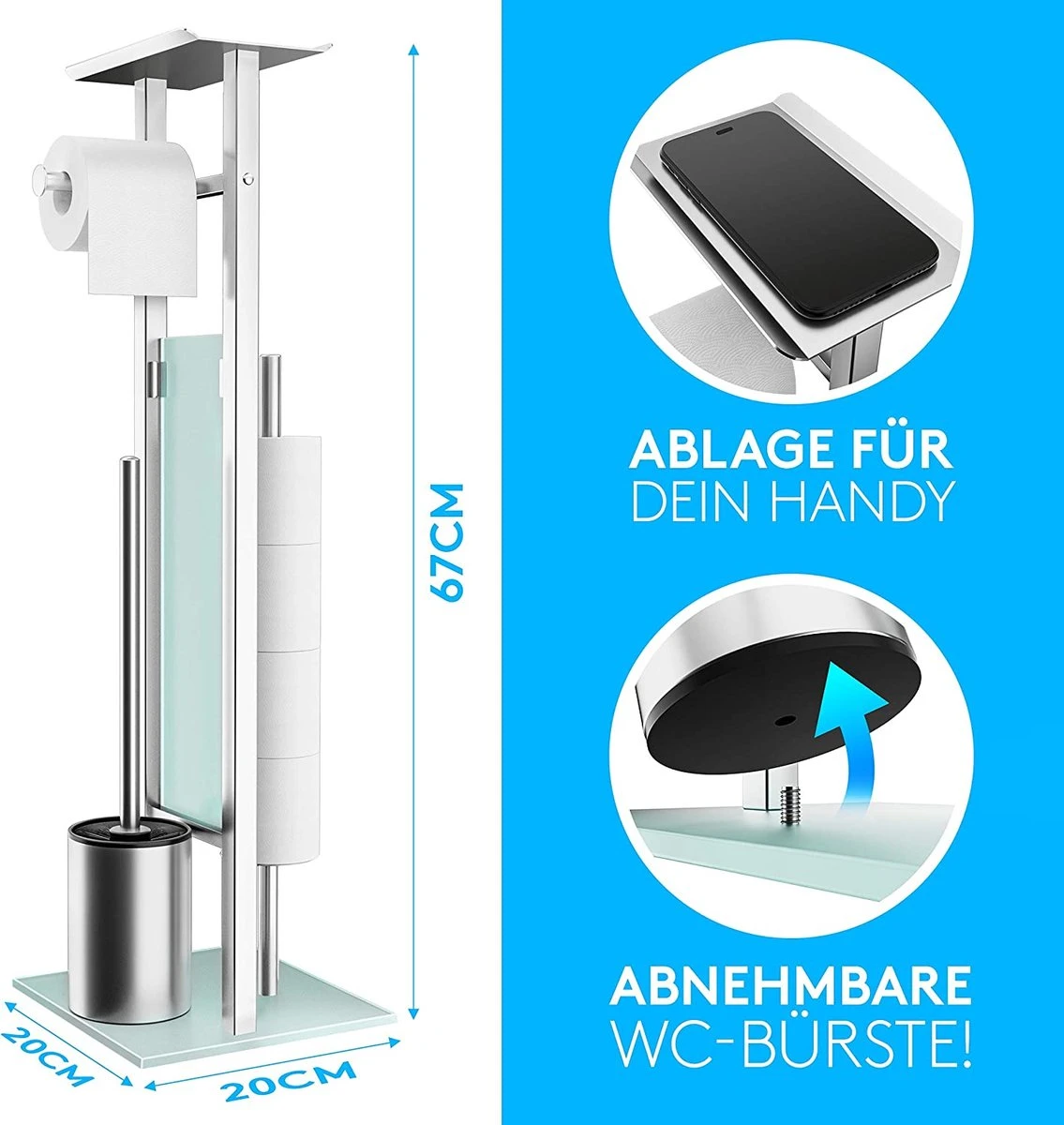 - Een eigen elegantie en praktisch punt – Met zijn mooie verchroomde afwerking en matglazen voet en tussenstuk maakt deze vrijstaande toiletrol- en borstelhouder het eenvoudig om uw badkamer netjes en opgeruimd te houden. Op zoek naar meer? Hij kan tot 4-5 rollen toiletpapier bevatten en heeft zelfs een plankje voor uw smartphone!