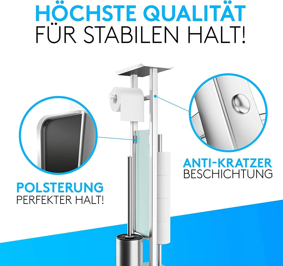 De licht naar boven gebogen plank aan de voorzijde van de toiletborstelset biedt een nog betere houvast voor uw badkameraccessoires: bovendien kan de standaard toiletpapierhouder gemakkelijk een belasting tot 2 kg aan. Ideaal voor: