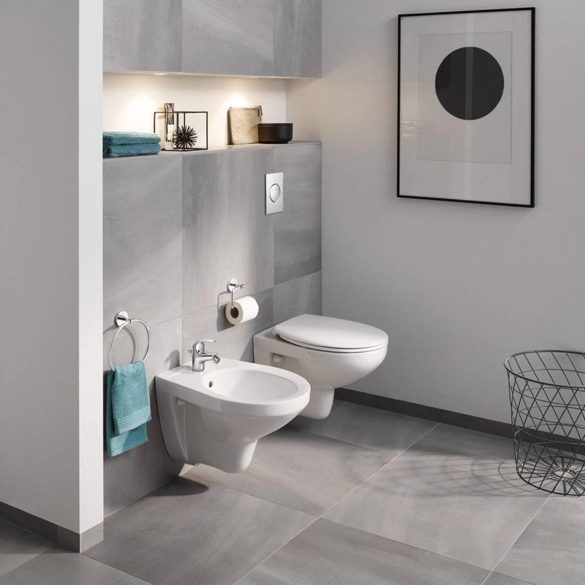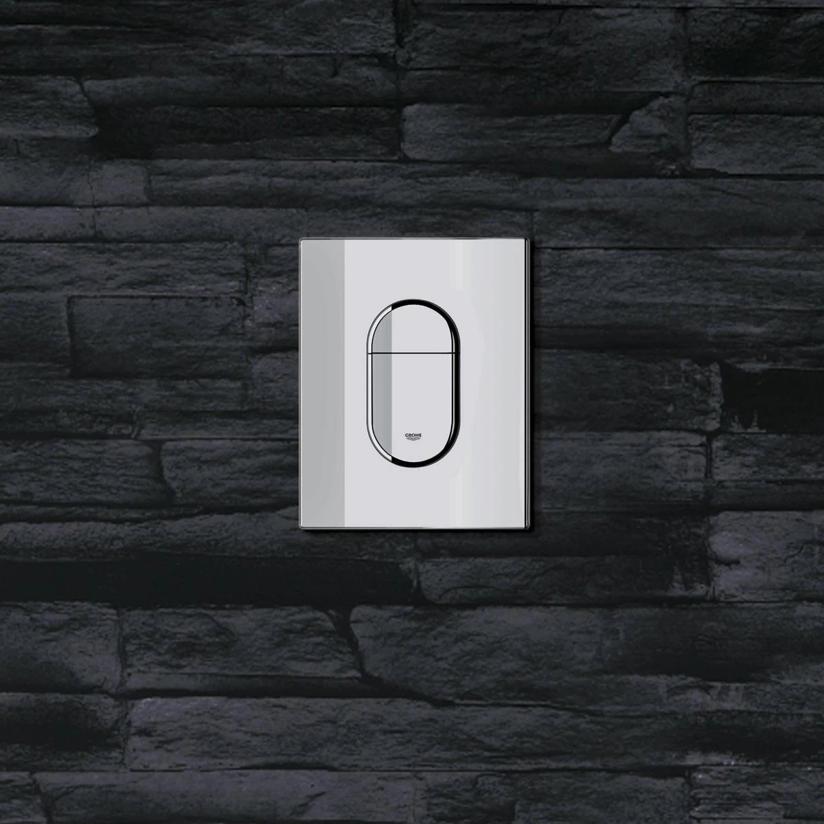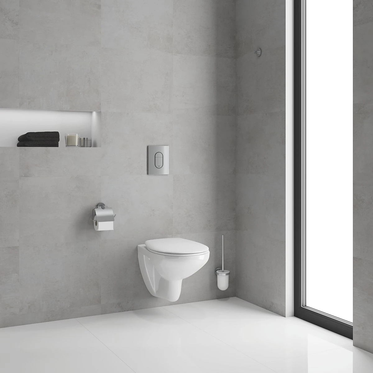 Deze set voldoet aan alle verwachtingen: de Grohe Bau Ceramic hangende wc en de Arena Cosmopolitan bedieningsplaat met een glanzende StarLight chroom afwerking.