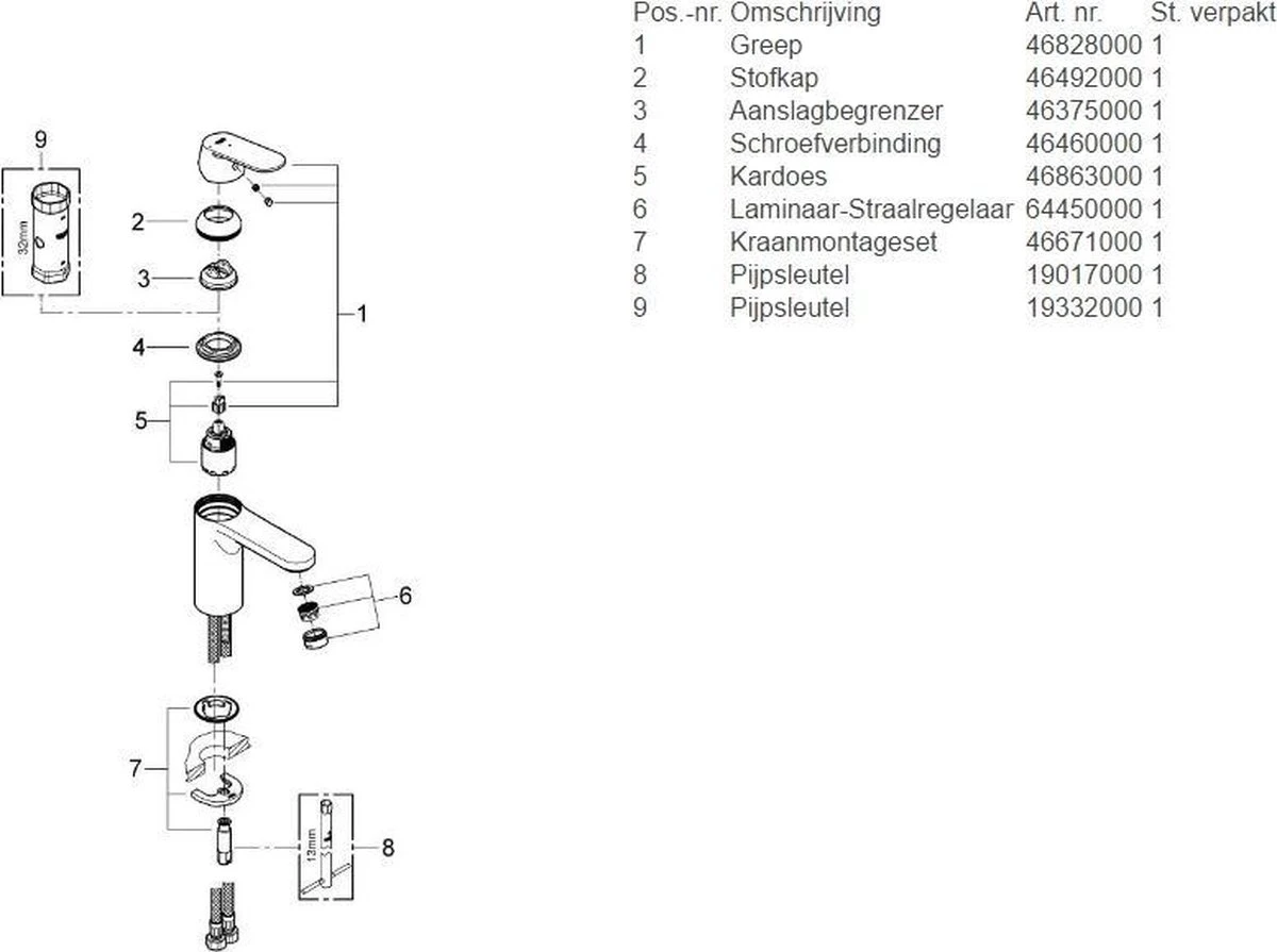 - Opbouwhoogte onderkant kraanmondstuk: 9,8 cm