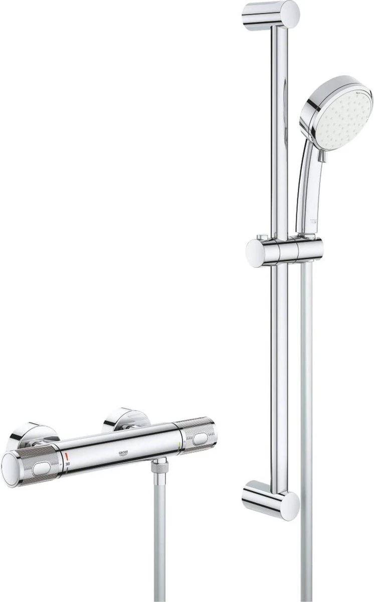 De Grohtherm 1000 Performance Thermostatische doucheset bevat alles wat je nodig hebt om je douche te upgraden naar iets stijlvollers, veiliger voor het hele gezin en vol gebruiksgenot. Ontworpen met dunne, cilindrische lijnen en oog voor elk detail, is het perfect voor het creëren van een minimalistische look met uitgebreide veiligheidsvoorzieningen, en dit alles voor een scherpe prijs. Deze opbouw thermostatische kraan is bedoeld om aan de wand te worden gemonteerd en bevat een GROHE Tempesta Cosmopolitan 100 doucheset. De bediening is eenvoudig dankzij de GROHE ProGrip ergonomische handgrepen met een gekarteld oppervlak dat een geweldige grip geeft, zelfs als je gladde handen hebt. Met zijn innovatieve 100% GROHE CoolTouch– ontwerp zorgt een inwendig koelkanaal ervoor dat het hele oppervlak nooit te warm wordt om aan te raken. GROHE TurboStat zorgt voor een constante toevoer van water op de perfecte temperatuur zonder onaangename schommelingen.