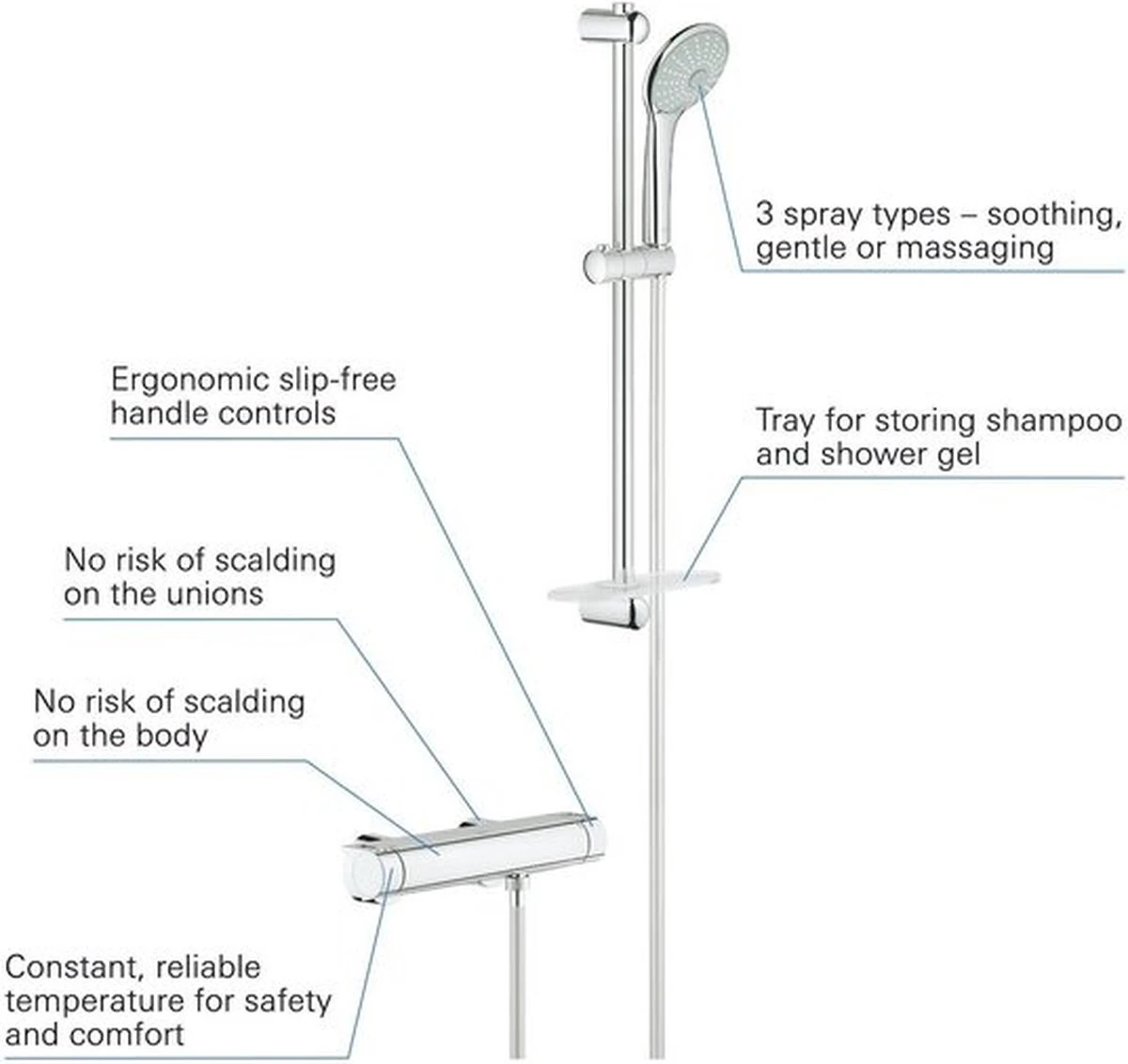 De Grohtherm 2000 douchethermostaat doet veel meer voor je dan alleen een constante temperatuur leveren. Deze stijlvolle kraan is uitgerust met ergonomische knoppen voor een intuïtieve en moeiteloze bediening. GROHE CoolTouch voorkomt dat de buitenkant van de thermostaatkraan te warm wordt zodat jij je niet kunt verbranden. Dankzij de GROHE SafeStop functie worden kinderen dubbel beschermd en kunnen ze de temperatuur niet te hoog zetten.* De GROHE EcoJoy technologie met EcoButton vermindert het waterverbruik tot wel 50% , zonder dat dit ten koste gaat van de prestaties.