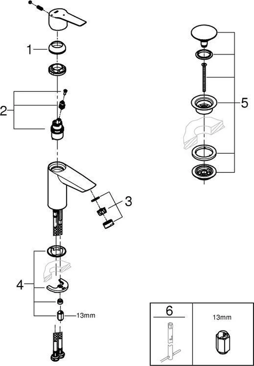 Je verspilt ook geen energie, omdat er alleen koud water uit de middelste hendelpositie stroomt. GROHE EcoJoy beperkt je waterverbruik tot 5,7 l/min zonder dat je daarbij inlevert qua prestaties. GROHE Zero geïsoleerde binnenwaterwegen zorgen ervoor dat het water in de kraan lood- en nikkelvrij is. En dankzij het GROHE QuickFix installatiesysteem met 3-in-1 tool en flexibele aansluitslangen kan je het binnen enkele minuten monteren. Het meegeleverde 3-in-1 tool draait de moer vast voor bladmontage, trekt de verbindingsslangen aan en verwijdert en bevestigt de beluchter als er onderhoud nodig is. Het is afgewerkt in de prachtige, slijtvaste GROHE StarLight chroom afwerking. Deze badkamerkraan zal er hierdoor jarenlang perfect uit blijven zien.
