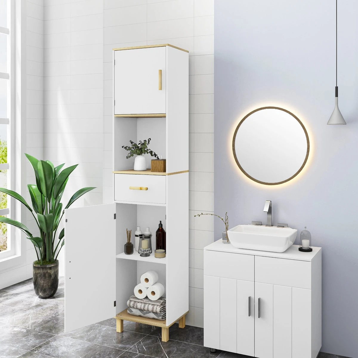 Het meubel biedt opbergruimte voor zowel tandenborstels, handdoeken en andere badkamer benodigdheden. De lade en opbergkast zorgen ervoor dat eender welk formaat van badkamerbenodigdheden opgeborgen kunnen worden.