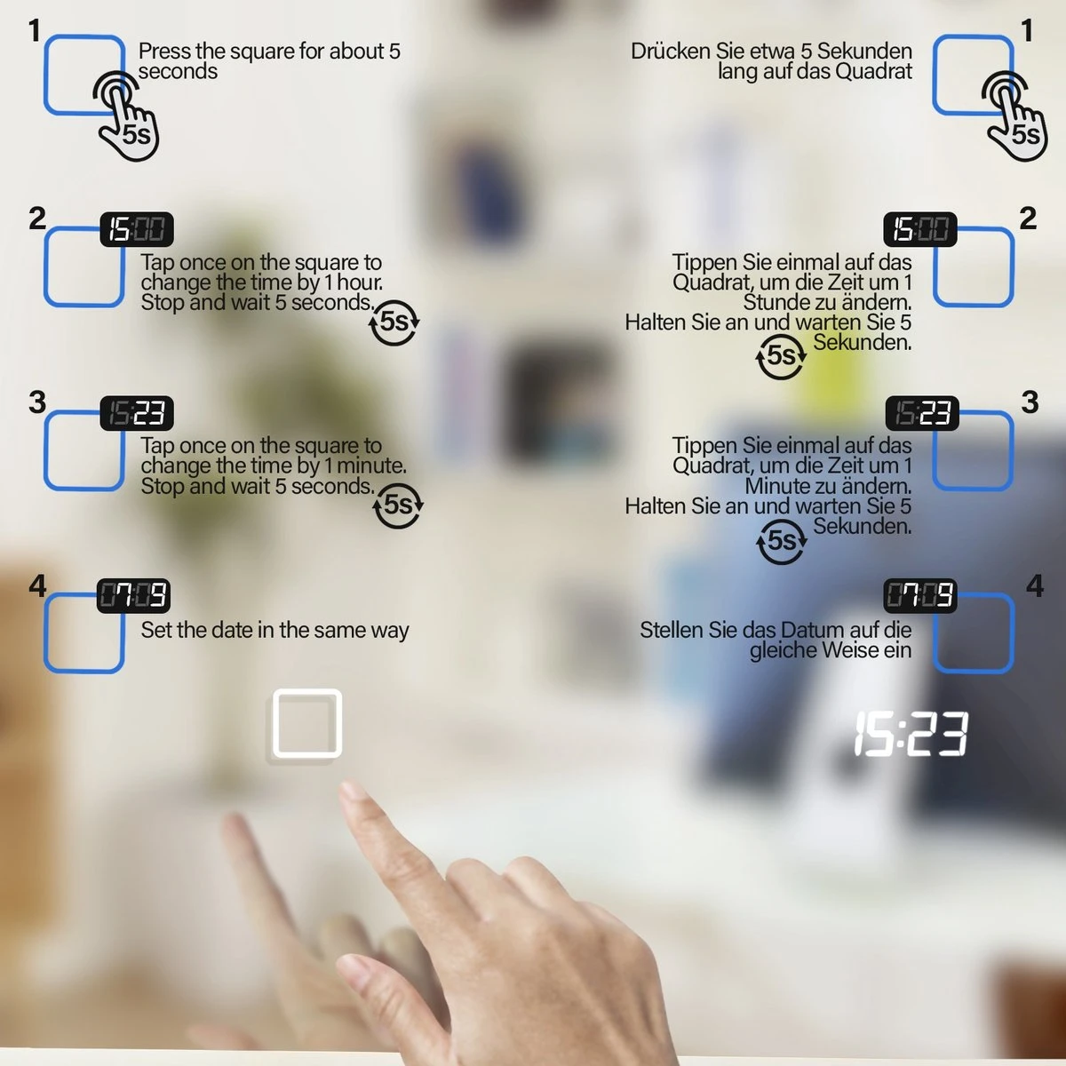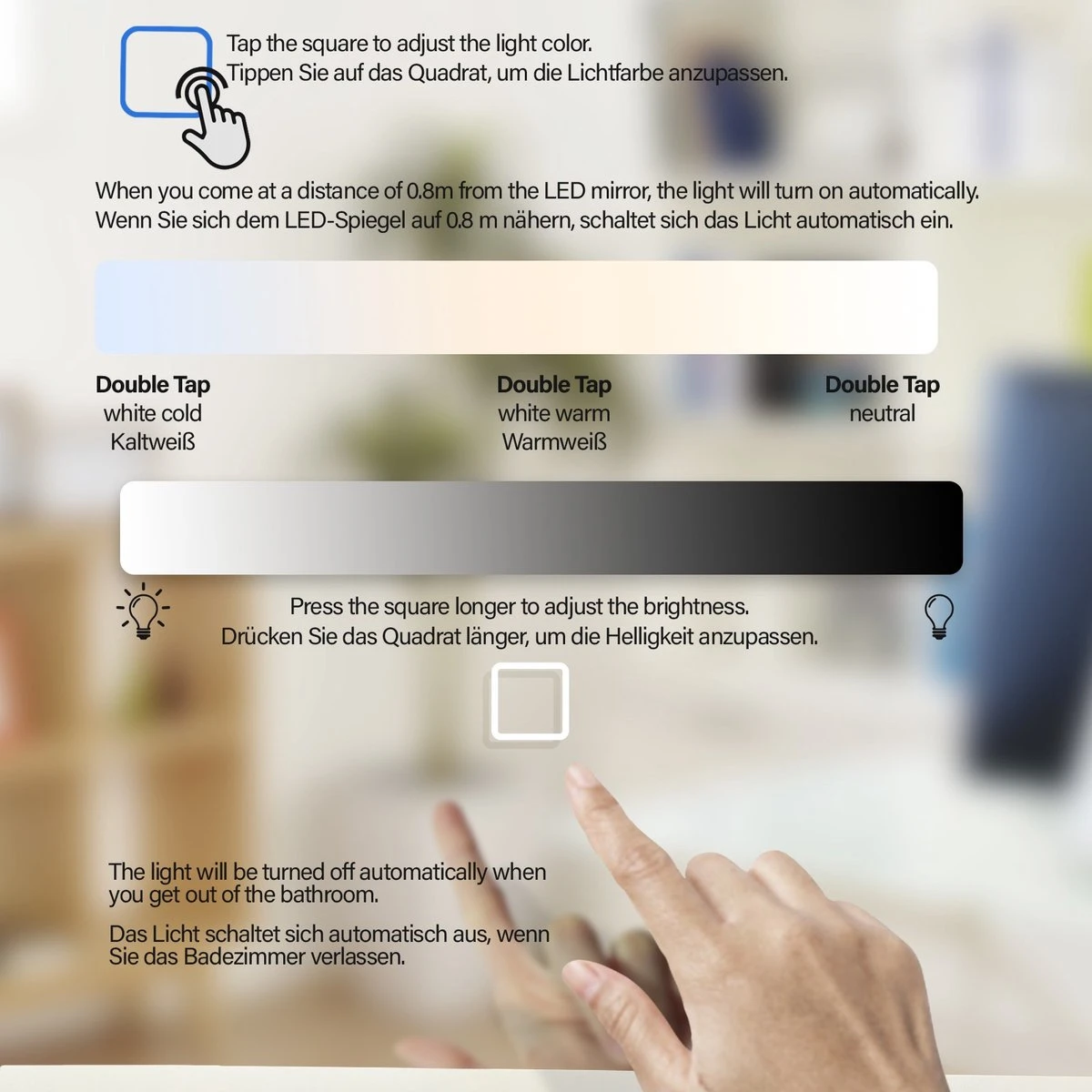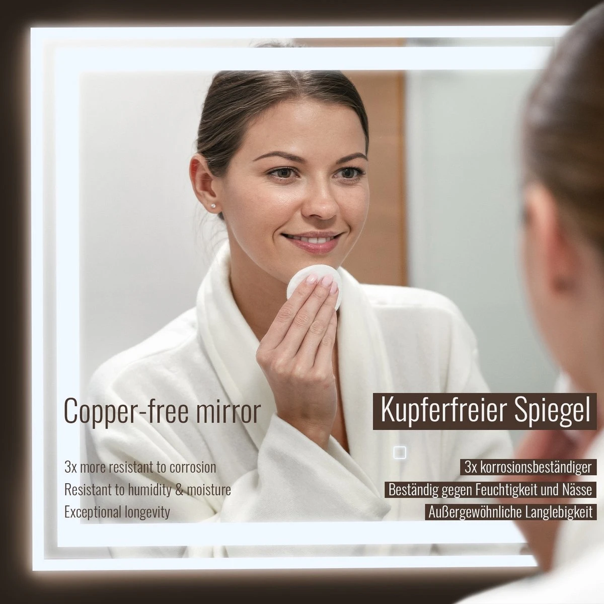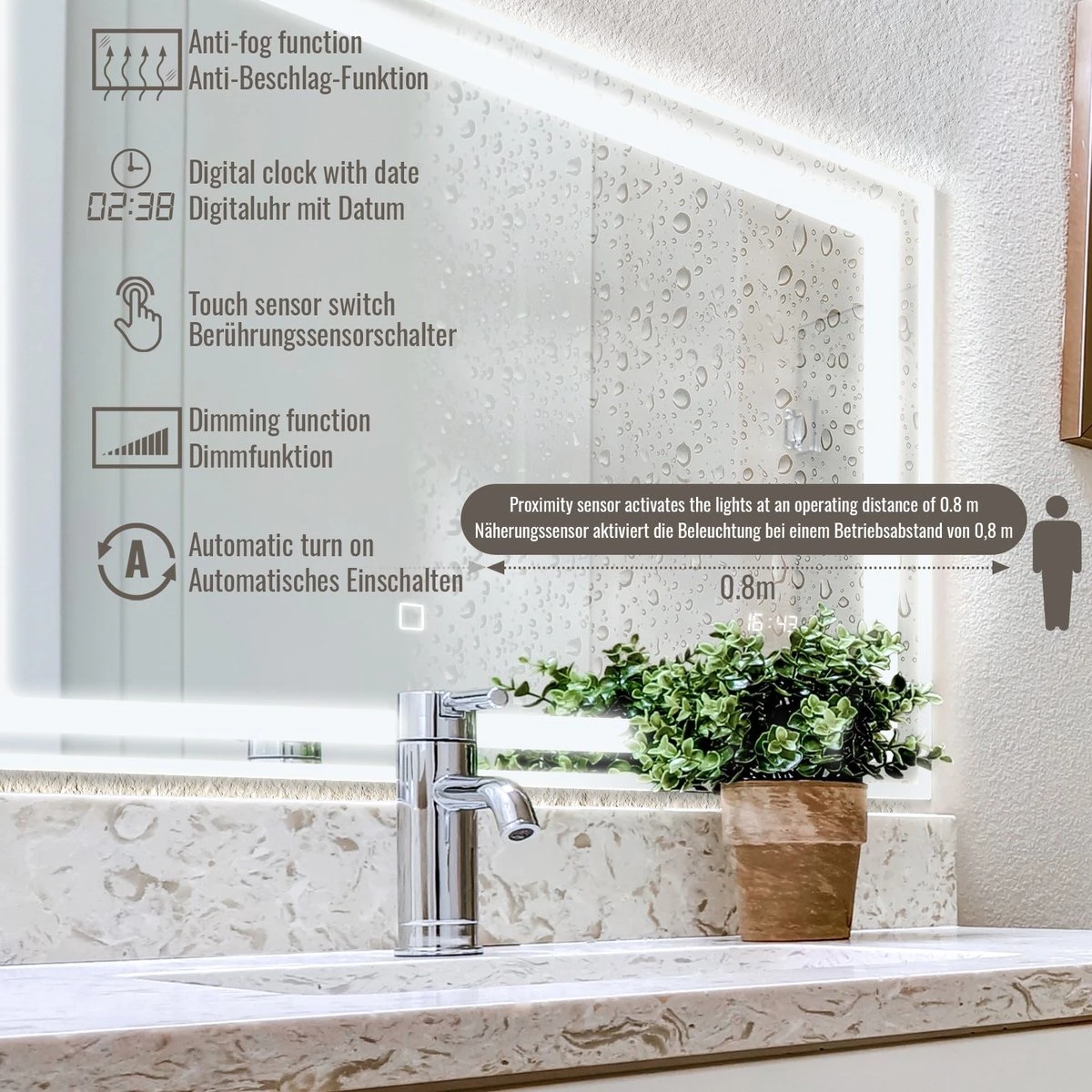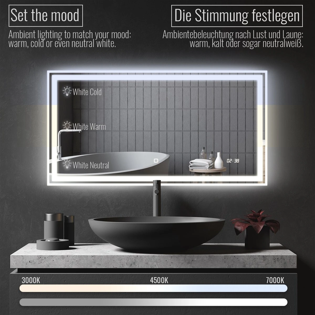 Breng een bijzondere, moderne sfeer in uw badkamer met onze verlichte spiegels in slank design. Deze verlichte badkamerspiegels hebben een digitale klok, anticondensfunctie, die automatisch wordt geactiveerd wanneer de led-verlichting wordt ingeschakeld. De lichtspiegels met aanraakbediening en dimfunctie zorgen voor een bijzondere kamerverlichting die bij je stemming past: warm, koud of zelfs neutraal LED wit.
