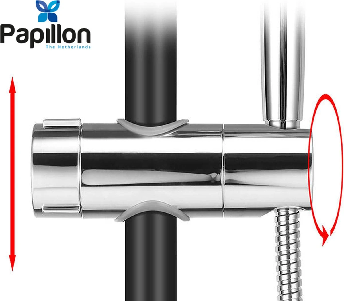 Eenvoudig aan te brengen op de glijstang: Opendraaien en op de stang klikken.