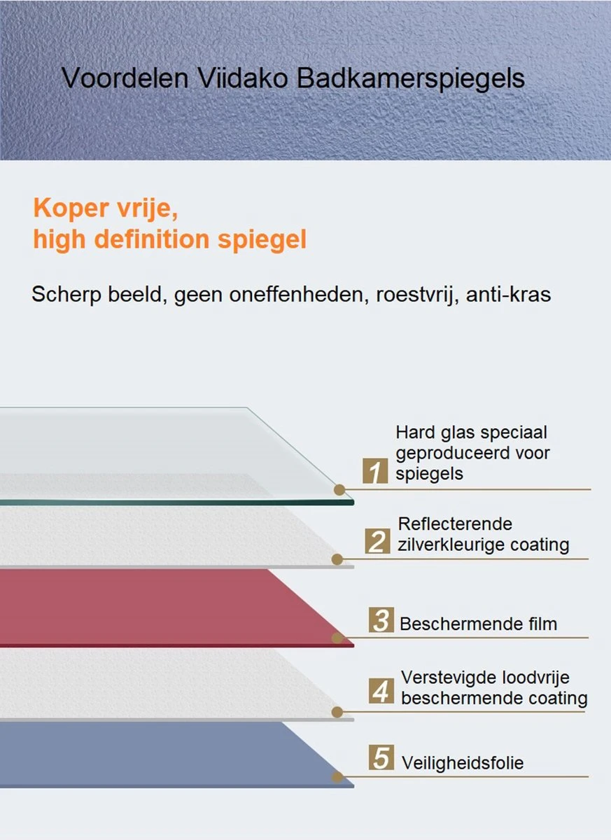 Onze badkamerspiegels zijn voorzien van een zogeheten koper- en loodvrije coating. Deze coating wordt in zeer schone omstandigheden aangebracht. Deze coating zorgt dat uw spiegel op den duur geen last kan krijgen van corrosie. Deze techniek wordt normaal alleen gebruikt in het duurdere segment spiegels.