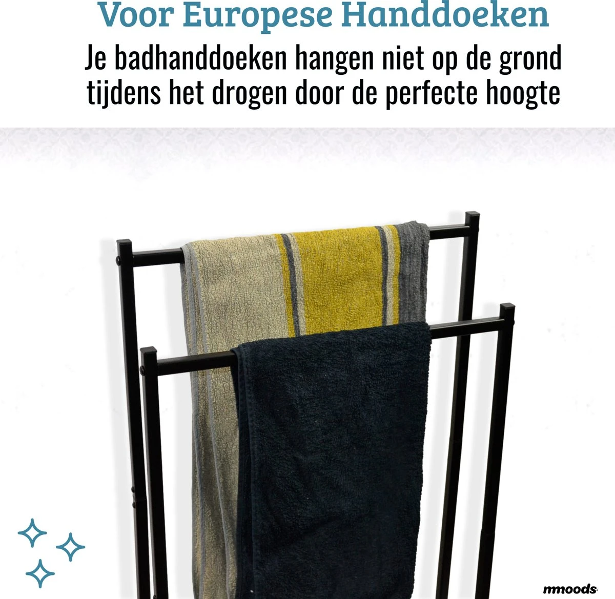 We snappen het, je hebt graag een grote handdoek om je volledig af te drogen, maar is die wel droog tegen de volgende keer dat je gaat douchen? De Mmoods handdoekhouder is van perfecte hoogte van 96 cm zorgt dat jouw handdoek niet op de grond hangt tijdens het drogen.