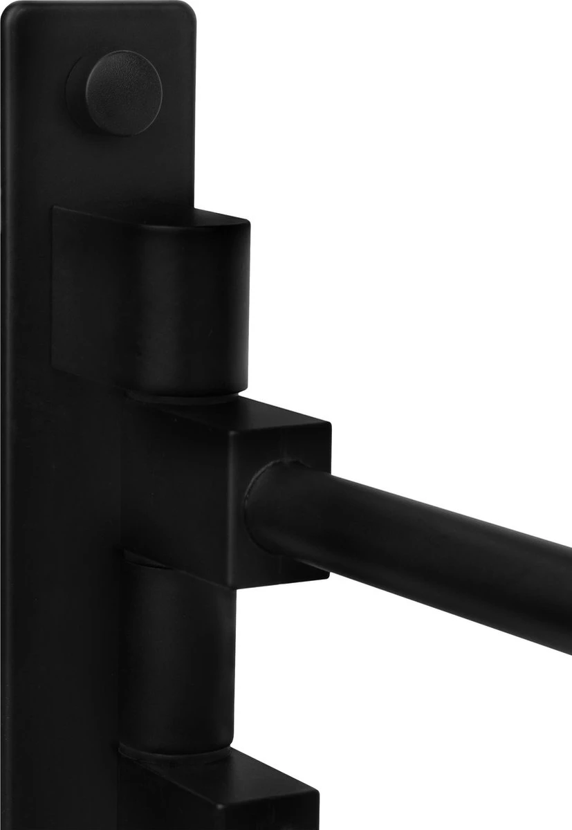 Het rek is volledig zwart en bestaat uit een as en vier verstelbare armen. De basis is onderaan voorzien van twee haakjes,waar je bijvoorbeeld een lufa of washandjes aan kunt hangen. Bij het ontwerp van dit handdoekenrek is dus overal aan gedacht.