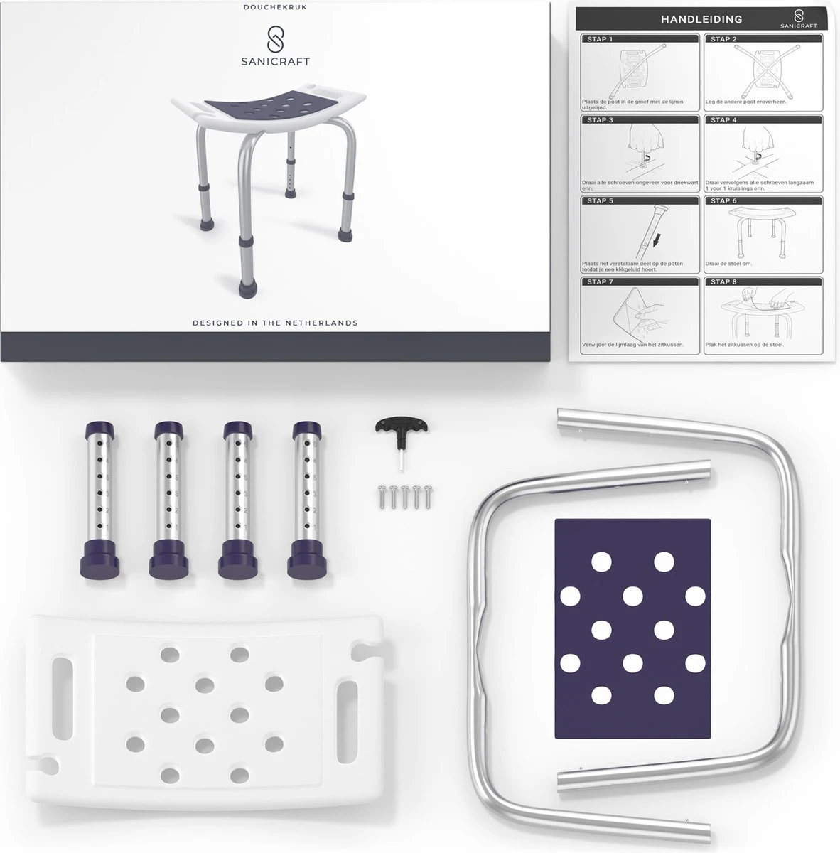 Wanneer je een douchekrukje koopt is het allerbelangrijkste dat hij veilig is, zodat je niet kunt vallen. Dit Sanicraft® douchekrukje voldoet aan alle veiligheidseisen. Door de anti-slip poten glijdt hij niet. Hij heeft handgrepen om je tijdens het douchen aan vast te houden. En hij is stevig genoeg om tot wel 150 kg te dragen. Je kunt hem dus met een gerust hart gebruiken.