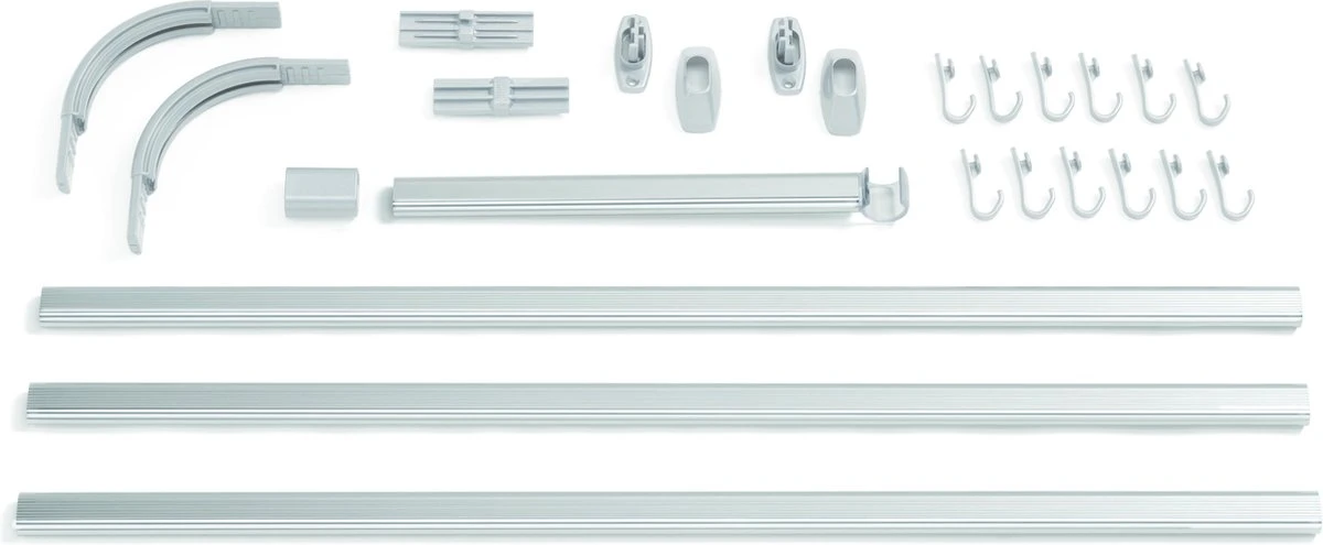 • Handig alles-in-één pakket voor het ophangen van een douchegordijn