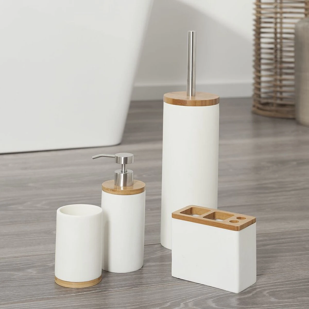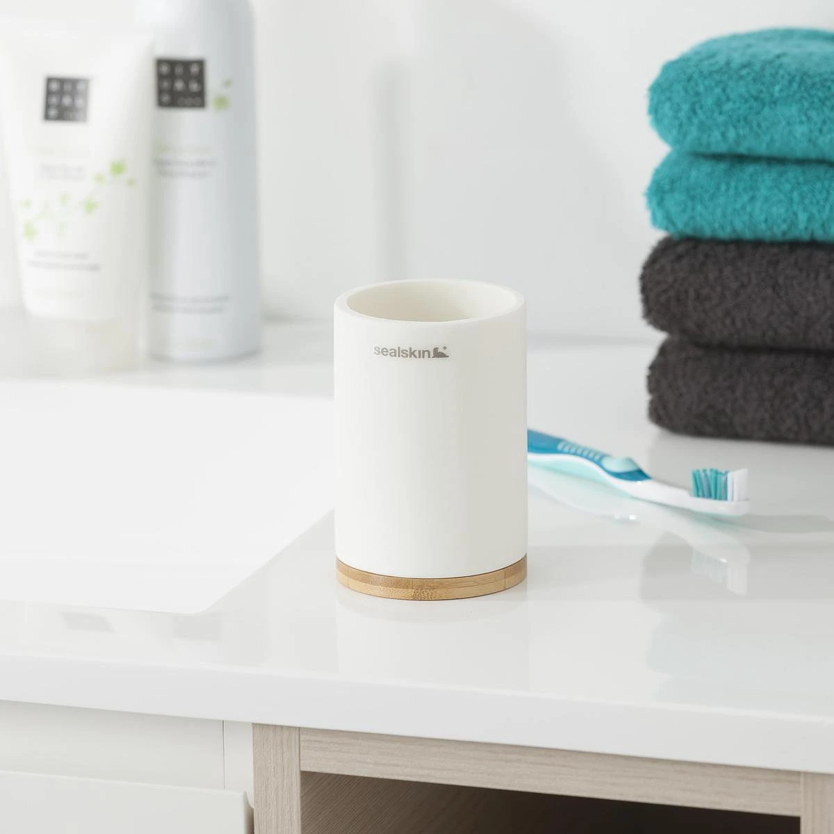 Gecombineerde materialen is de trend van nu. De Sealskin Grace serie in wit polyresin gecombineerd met bamboe accenten, sluit daar perfect bij aan. De beker is eenvoudig te reinigen met een vochtige doek.