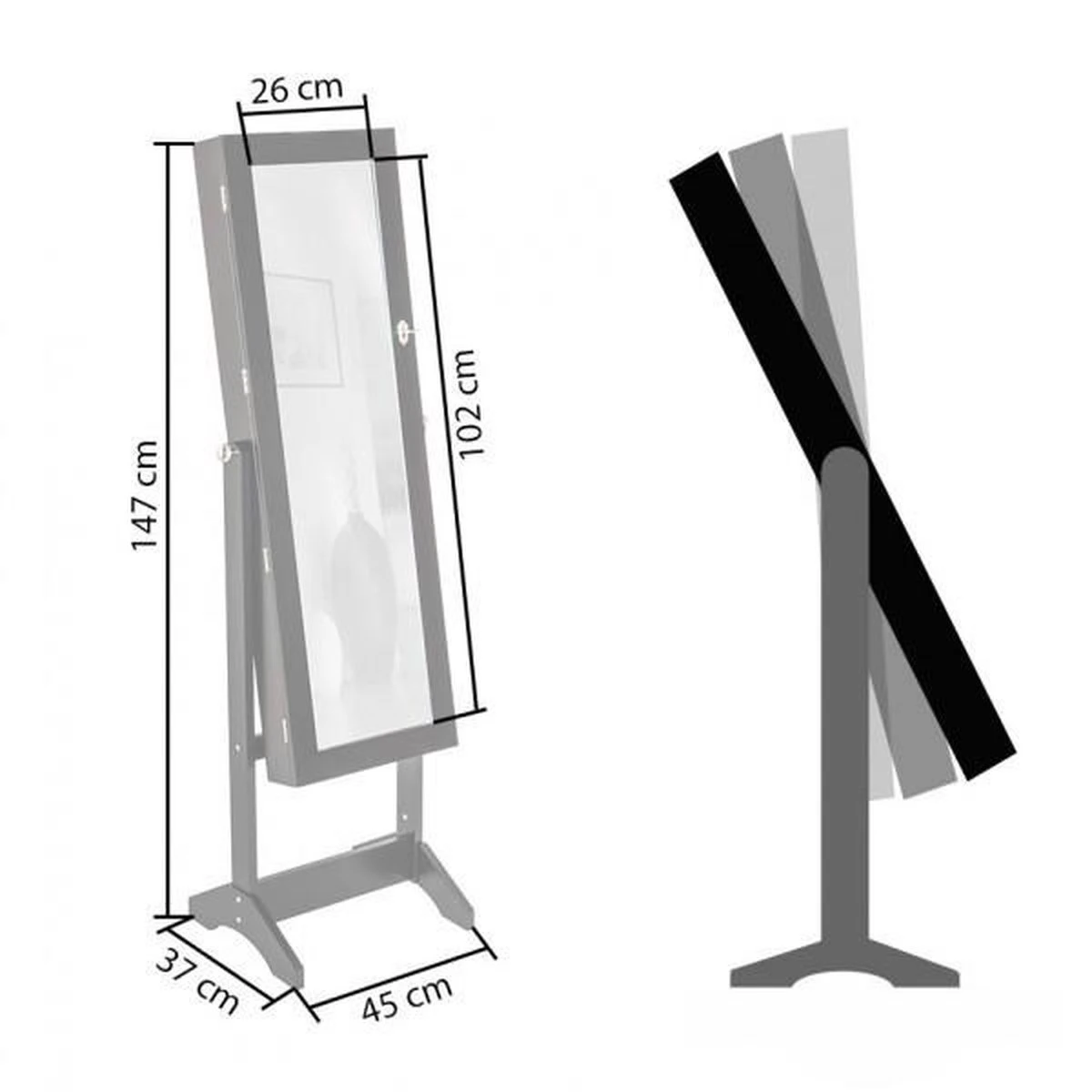 Met deze elegante spiegelkast, kunt u uw sieraden en accessoires overzichtelijk en stofvrij opbergen. De spiegelkast onderscheidt zich door zijn mooie kwaliteit, en aandacht voor detail. Een welkome aanvulling voor elke badkamer, slaapkamer of kleedkamer. Door de vele haken en vakjes, kunt u altijd uw kettingen, ringen, oorbellen, horloges etc netjes en gesorteerd opbergen. De spiegelkast kan gekanteld en vastgezet worden in standen, voor iedere persoon en elke lengte dus optimaal af te stemmen.
