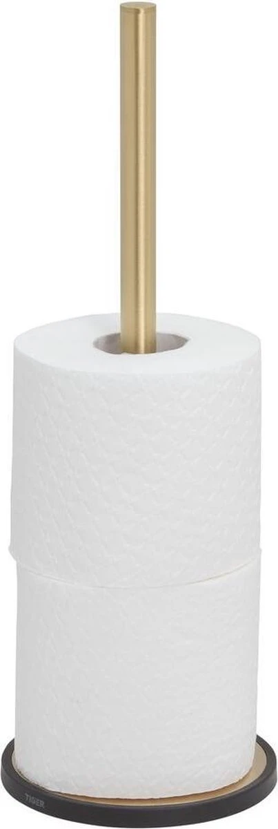 De vrijstaande reserverolhouder uit de Tune serie van Tiger is uitgevoerd in de kleur geborsteld messing gecombineerd met mat zwarte accenten. Met dit accessoire zijn drie extra rollen toiletpapier op fraaie wijze op te bergen nabij je toilet. De Tune serie bevat tevens een groot aantal aanvullende accessoires voor de badkamer en toiletruimte in dezelfde stijl.