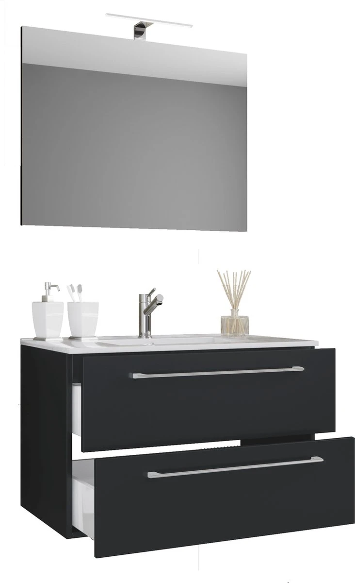 Set bestaande uit: – 1x badmeubel met twee laden – 1x wastafel van keramiek – 1x spiegel van gehard veiligheidsglas De badmeubelset bestaat uit een badmeubel met twee laden op robuuste metalen geleiders. Een moderne wastafel van massief keramiek en een spiegel van ESG-veiligheidsglas ronden het meubel af tot een perfecte blikvanger in de badkamer. Badmeubel – afmetingen H. 52 x b. 61 x d. 46 cm of h. 52 x b. 81 x d. 46 cm – Romp van robuust en ongevoelig melamine – Twee grote lades met duurzame metalen trekkers – Handgreep in aluminium-look metaal Wastafel: – Afmetingen h. 17 x b. 60 x d. 46 cm of ca. h. 17 x b. 80 x d. 46 cm – Gemaakt van robuust keramiek Spiegel: – Afmetingen h. 40 x B. 60 D. 2 cm of ca. H. 40 x B. 80 D. 2 cm – Glas van ESG veiligheidsglas Meubels kunnen worden aangevuld met andere “VCM Badinos” badkamermeubels en “VCM Blino” verlichting. VCM is sinds de jaren zeventig gespecialiseerd in het ontwerpen, produceren en distribueren van meubelen met een eerlijke prijs-kwaliteitverhouding en heeft er al miljoenen huishoudens mee verfraaid.