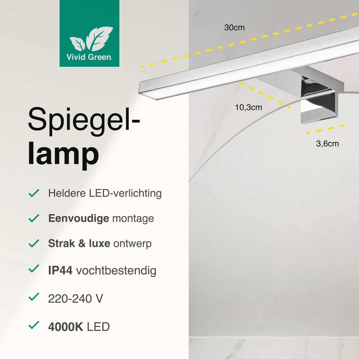 Strakke moderne verlichting voor in je badkamer. Dat is waar de Vivid Green spiegellamp voor zorgt. Deze luxe chromen LED armatuur schijnt neutraal wit licht zodat jij voldoende verlichting hebt in de badkamer. En maak je maar geen zorgen over vocht, de lamp is IP44 spatwaterdicht.