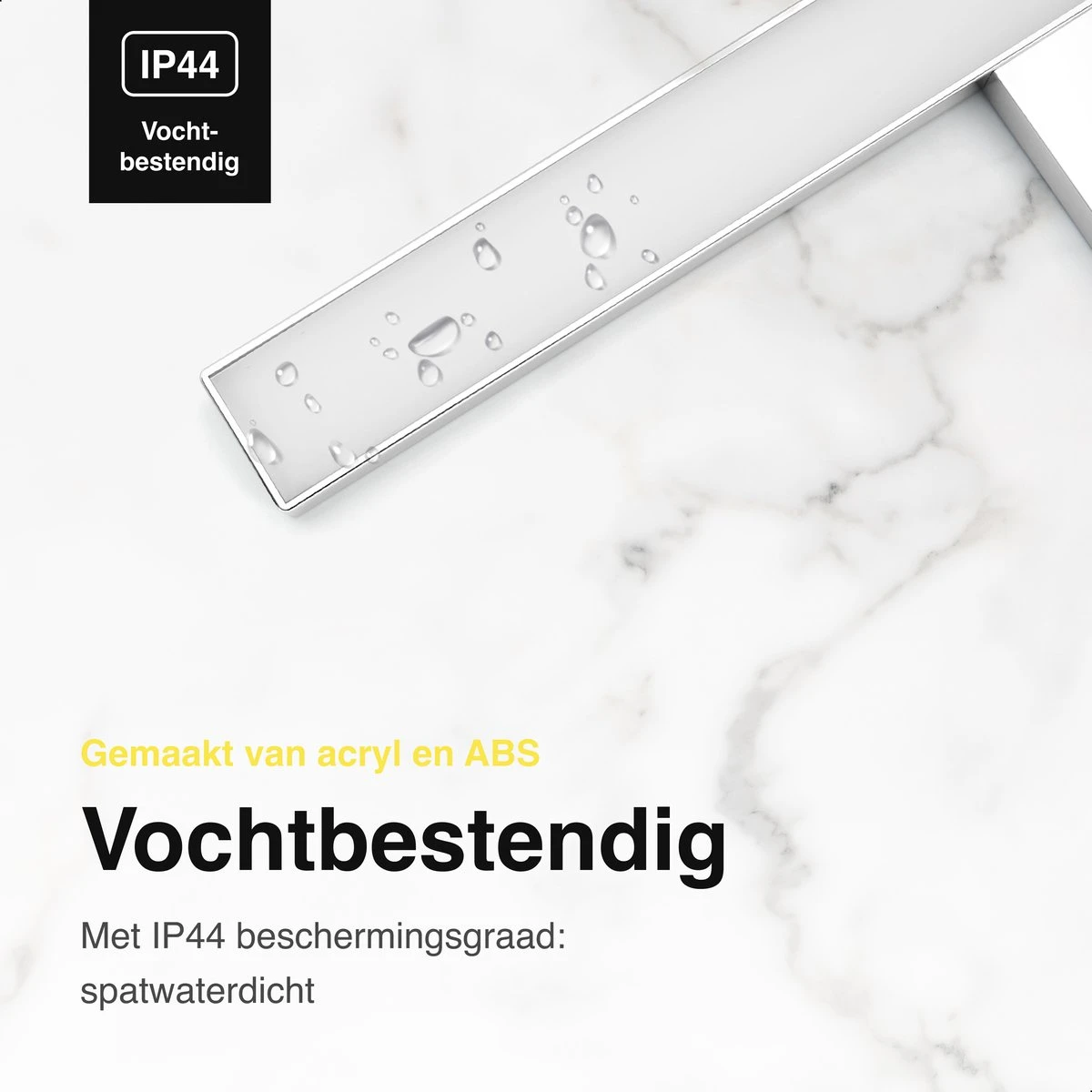 Met het chromen oppervlak en het strakke rechthoekige design geeft deze spiegellamp jouw badkamer een moderne touch. Met de neutrale witte verlichting zie je alles perfect en helder in de spiegel. Plaats de lamp over de spiegel of op je badkamerkast, sluit hem aan op het net en bekijk het verschil!