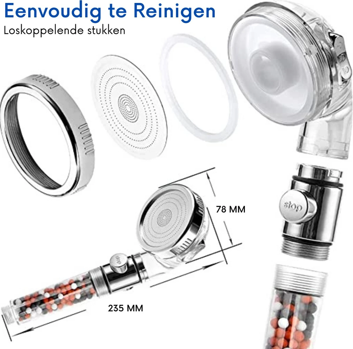 De douchekop is voorzien van zuiverende mineraalstenen. De gemineraliseerde stenen zorgen voor een aangepaste PH-waarde van het water. Dit heeft een zuiverend effect ten opzichte van bacteriën, metalen en chloor die zich in het water bevinden. Dit draagt bij aan zachter en sterker haar, een gladdere en gezondere huid en een betere bloedsomloop!