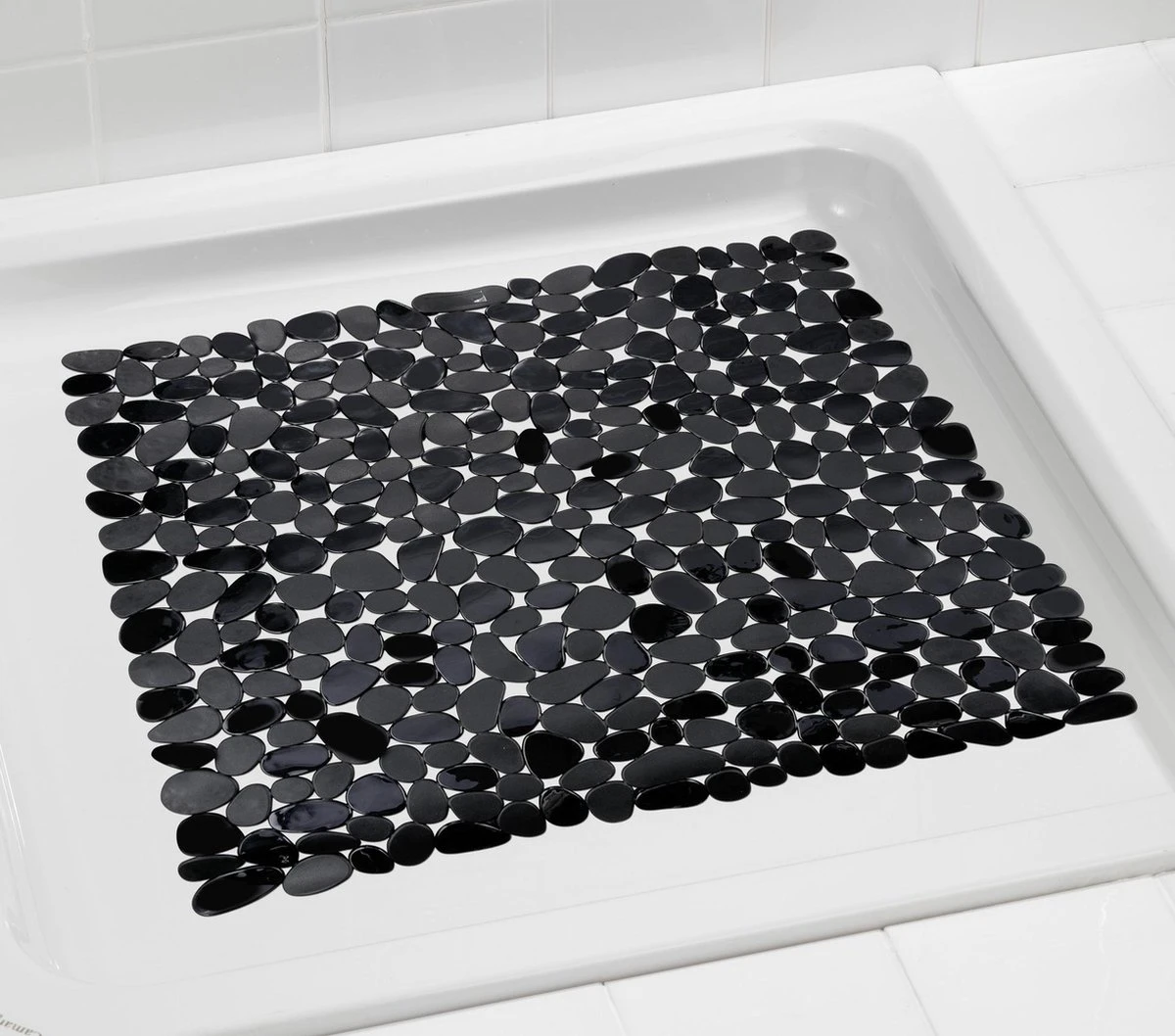 Dankzij de vierkante vorm van 54 x 54 cm past de mat in alle gangbare douchebakken.